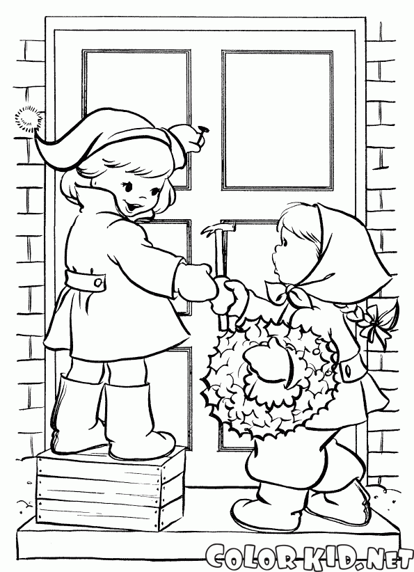 Malvorlagen - Kinder hängen einen Kranz